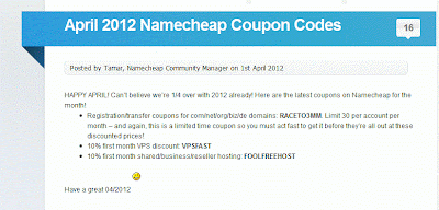 Caranya adalah dengan search di google.com, keyword berikut: namecheap coupon april 2012 Jika sekarang bulan Juli dan tahun 2012, ya search di google: namecheap coupon juli 2012. Seringkali dari hasil result google sudah dapat diketahui kode kupon namecheap seperti yang saya beri kotak merah di gambar di bawah ini: