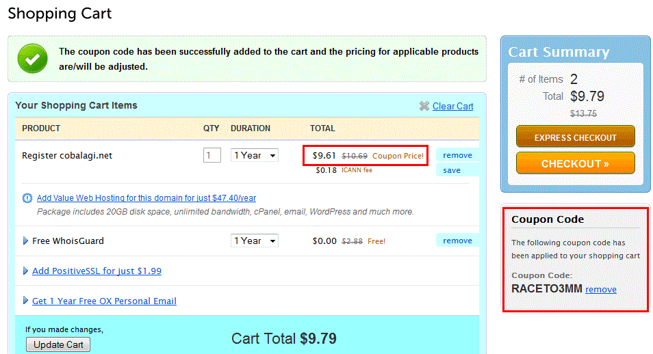 3. Setelah mendapatkan kode kupon diskon, saat proses pembelian domain di NameCheap, masukkan kode kupon tersebut dan klik tombol Apply Coupon dan harga domain otomatis akan berubah menjadi $9.79. Tapi perlu diingat, untuk mennggunakan kupon tersebut, Anda harus login sebagai member namecheap. Untuk menjadi member, proses registrasi nya GRATIS.